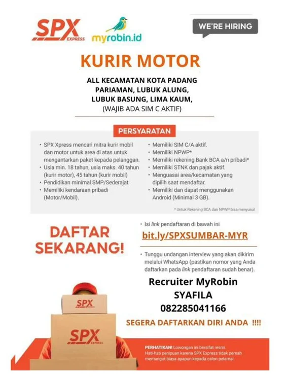 PT. SPX Logistics sedang mencari kandidat yang energik dan berdedikasi untuk mengisi posisi Kurir Motor di wilayah Kota Bekasi. Sebagai bagian penting dari jaringan distribusi e‑commerce dan layanan logistik regional, kurir SPX bertanggung jawab memastikan setiap paket, dokumen, atau barang sampai ke tangan pelanggan tepat waktu, aman, dan dalam kondisi prima. Posisi ini menawarkan kesempatan bagi individu yang menguasai navigasi perkotaan, memiliki motor pribadi, serta ingin berkarir dalam industri logistik yang terus berkembang.