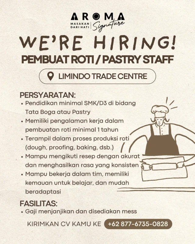 - Pengalaman kerja sebagai baker minimal 1 tahun di lingkungan produksi roti atau pastry.